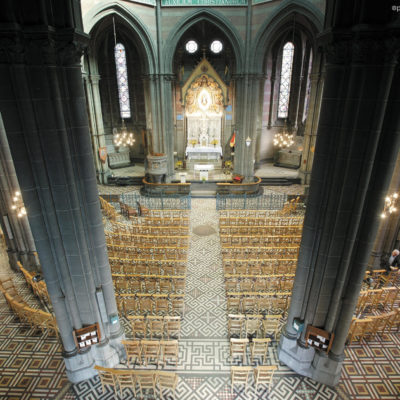 Het neogotische achthoekige gebouw met een Byzantijnse noot dient als decor voor het eikenhouten beeld van de Maagd Maria.